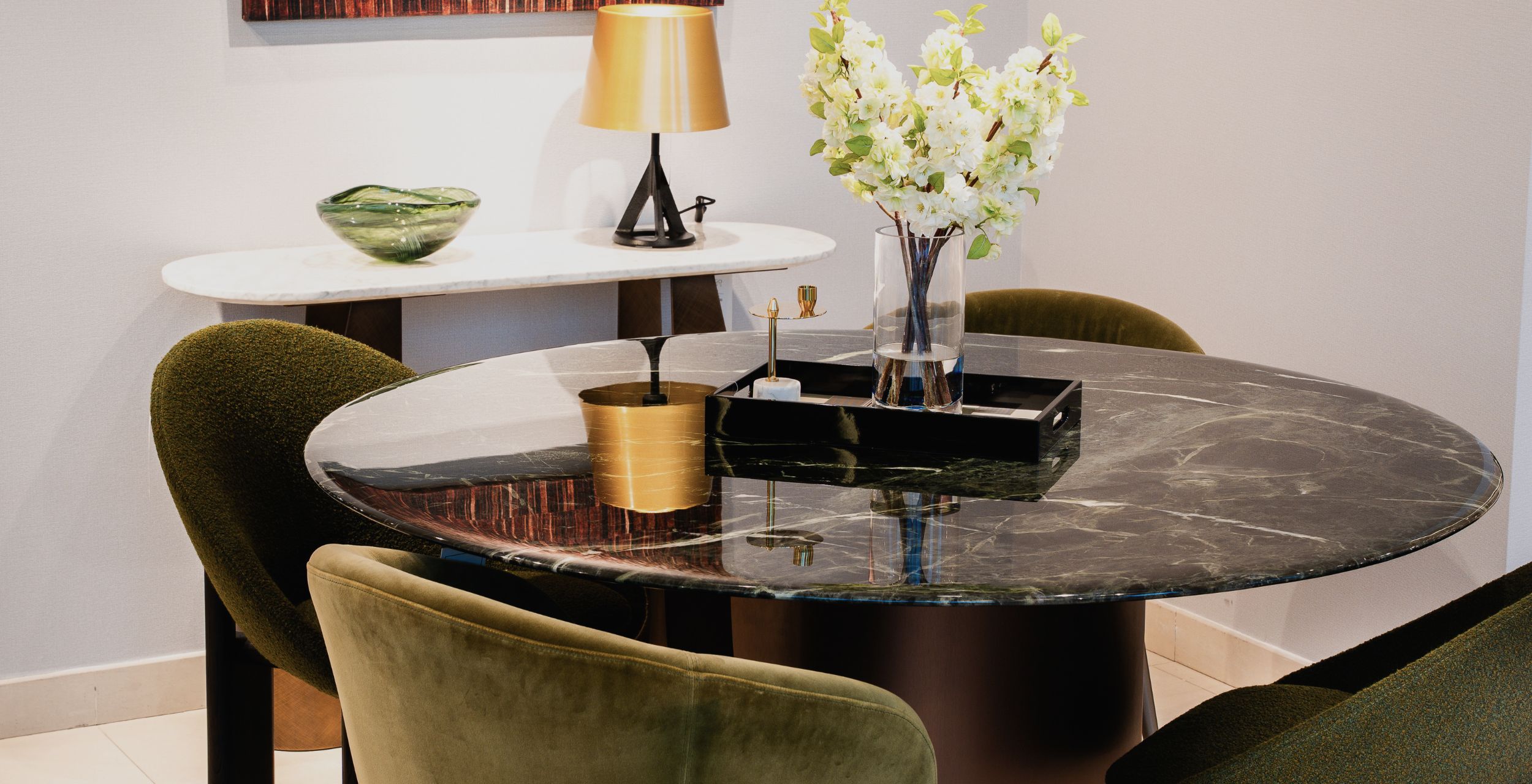 Enter the refined realm of Vogue Vista, our latest design vanguard. In this trend, sleek Indigo pieces lay the groundwork for striking statement elements, blending bone inlay and velvet with lustrous metals for enduring elegance. Vogue Vista unites reflective finishes with playful geometrics, inviting a youthful spirit into the space. Vibrant color accents and intriguing forms transform everyday objects into focal points of fascination and style.