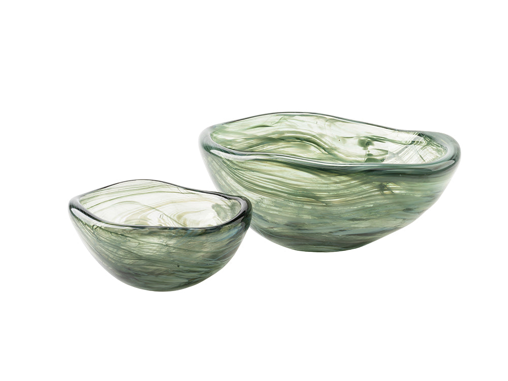 Alabaster Glass Bowl is a great fit for your modern table setting. Available in 2 sizes, these glass bowls are made of clear glass with a rich green colour swirling effect, 100% handmade, the shape and pattern will look different and unique from piece to piece, making it one-of-a-kind. A gorgeous addition to your dining table or console table.
