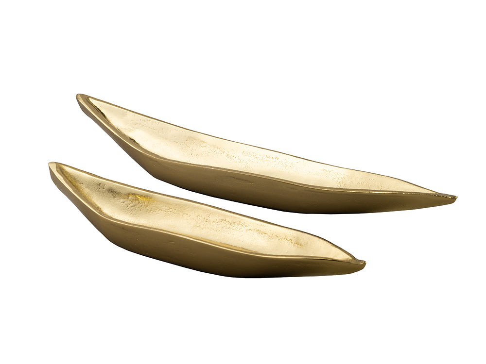 With an elegant gold finish, these boat-shaped trays are of the perfect size and scale for today's modern home. An optimal choice for putting keys and small accessories on. Available in 2 sizes.