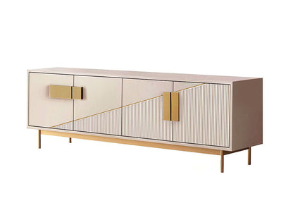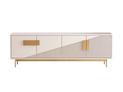 The Somerton Collection featuring a cream lacquer finish, fluted panels, inset metal details and bronze metal pulls and legs, these timeless pieces are an excellent addition to a contemporary home.The Somerton Sideboard provides ample storage with height adjustable shelves behind four doors.